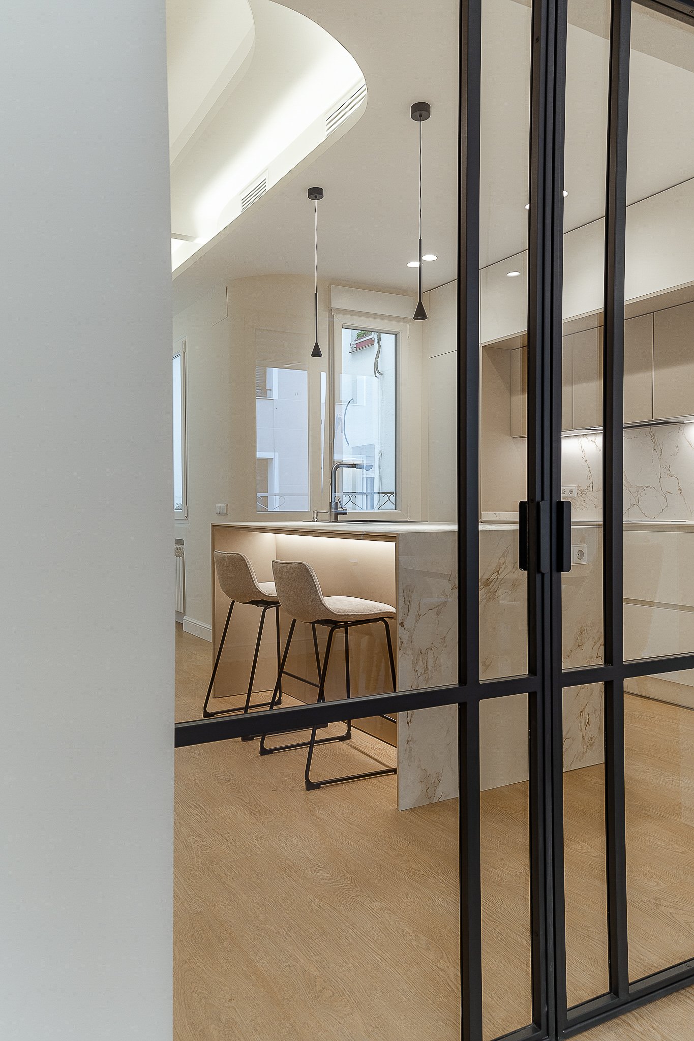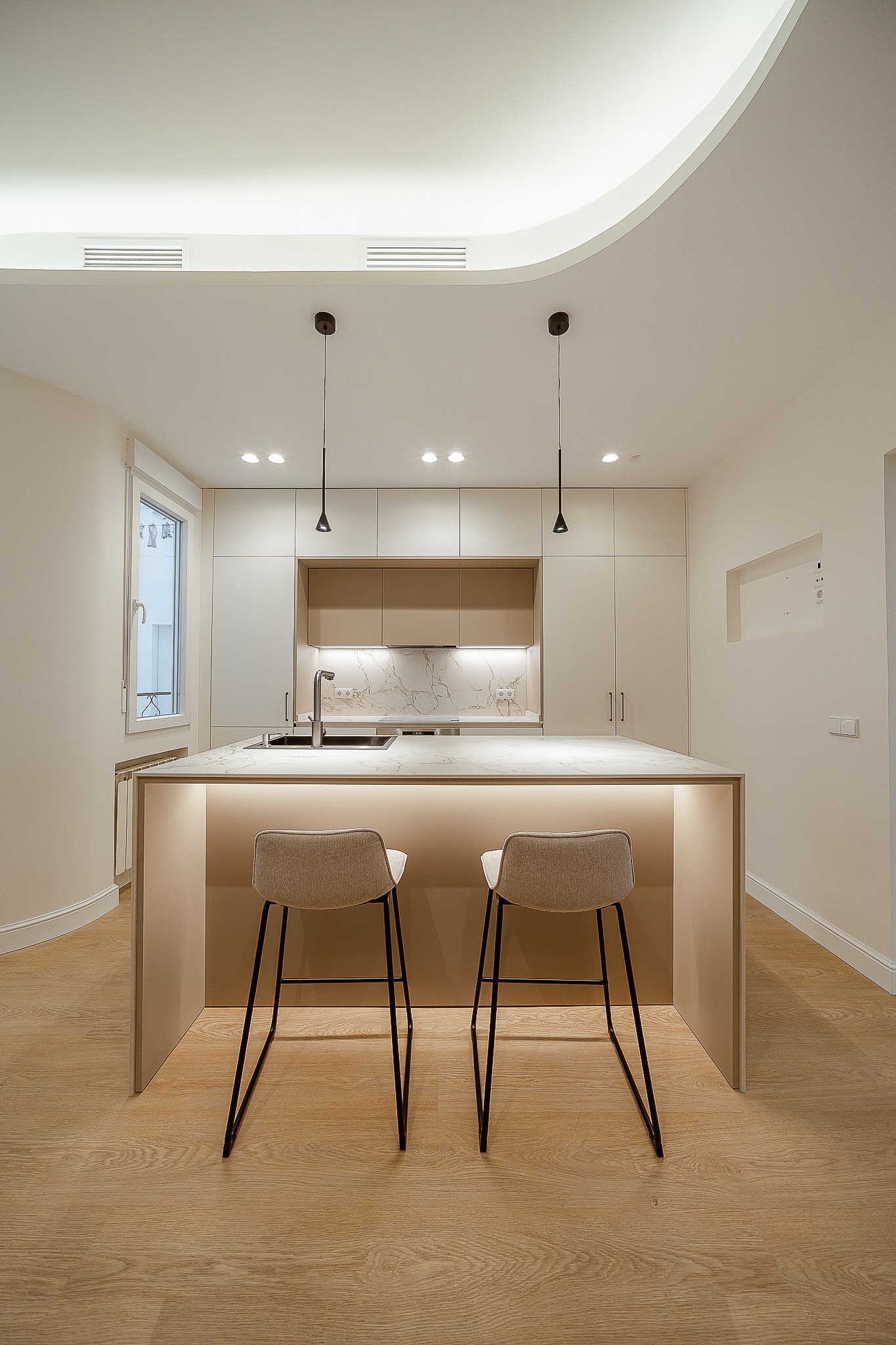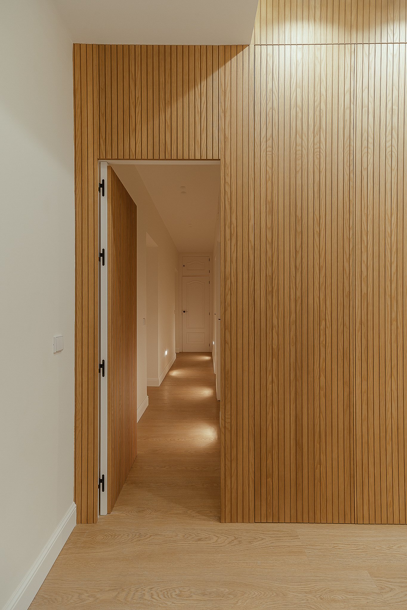 En esta vivienda la intervención principal se realizó en la zona pública. Tras demoler la tabiquería que dividía los espacios, ganamos un amplio espacio con luces a los patios interiores donde diseñamos la cocina. Dándole importancia con una isla y un diseño que se integra en la vivienda. Para diferir visualmente la parte privada, diseñamos un panelado de madera que oculta la puerta de paso y la zona de almacenaje y lavandería de la cocina, eliminando todo el ruido visual.