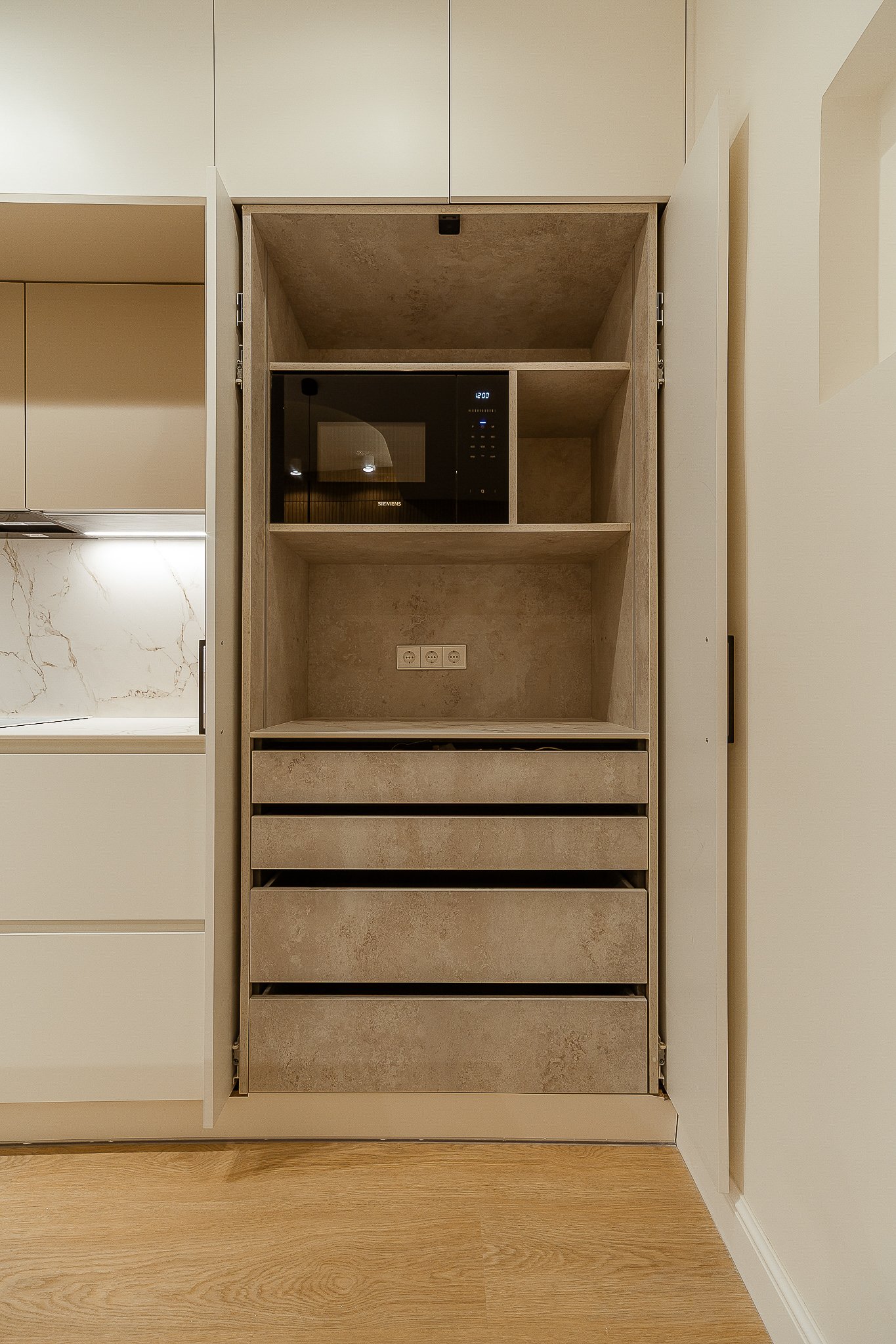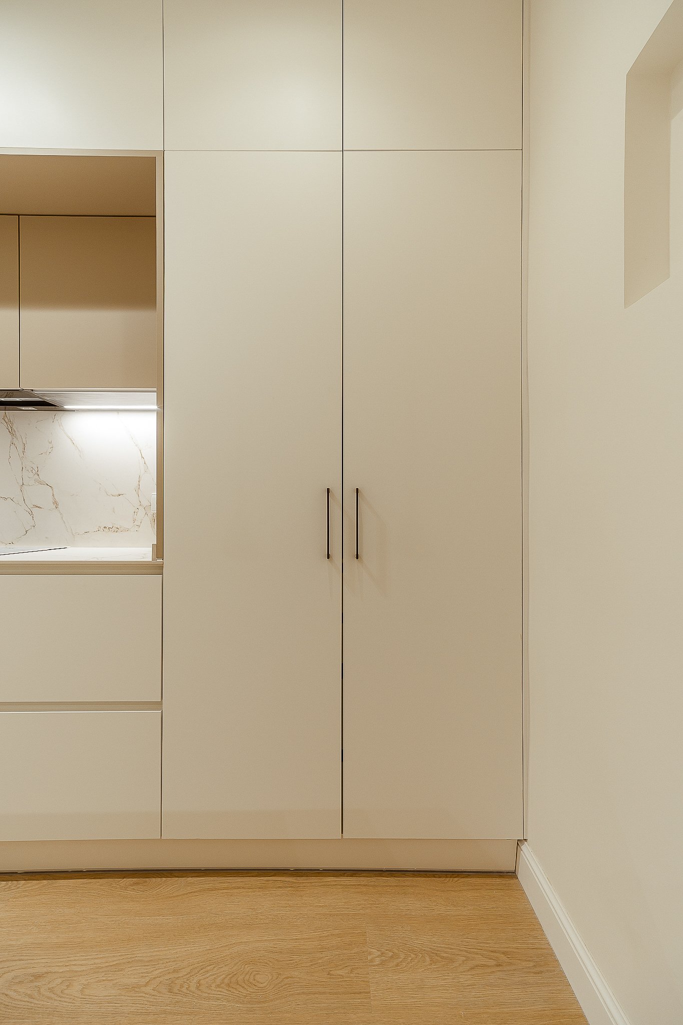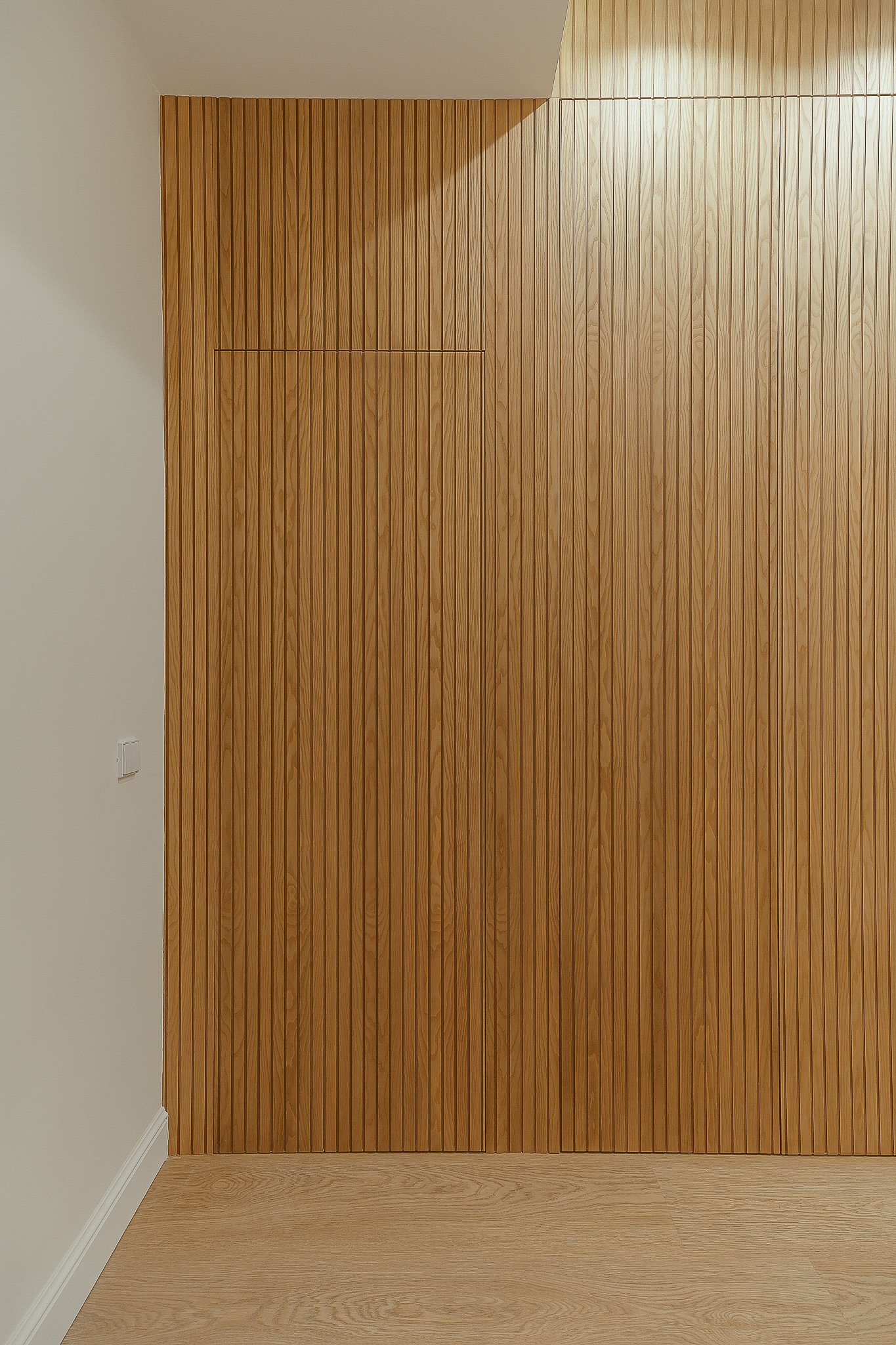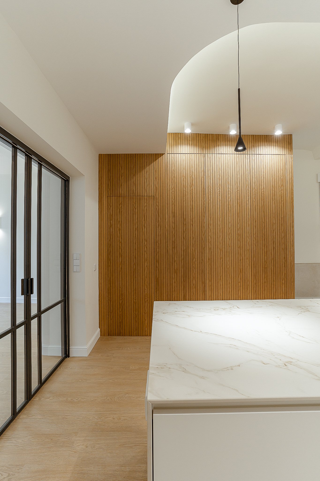 En esta vivienda la intervención principal se realizó en la zona pública. Tras demoler la tabiquería que dividía los espacios, ganamos un amplio espacio con luces a los patios interiores donde diseñamos la cocina. Dándole importancia con una isla y un diseño que se integra en la vivienda. Para diferir visualmente la parte privada, diseñamos un panelado de madera que oculta la puerta de paso y la zona de almacenaje y lavandería de la cocina, eliminando todo el ruido visual.