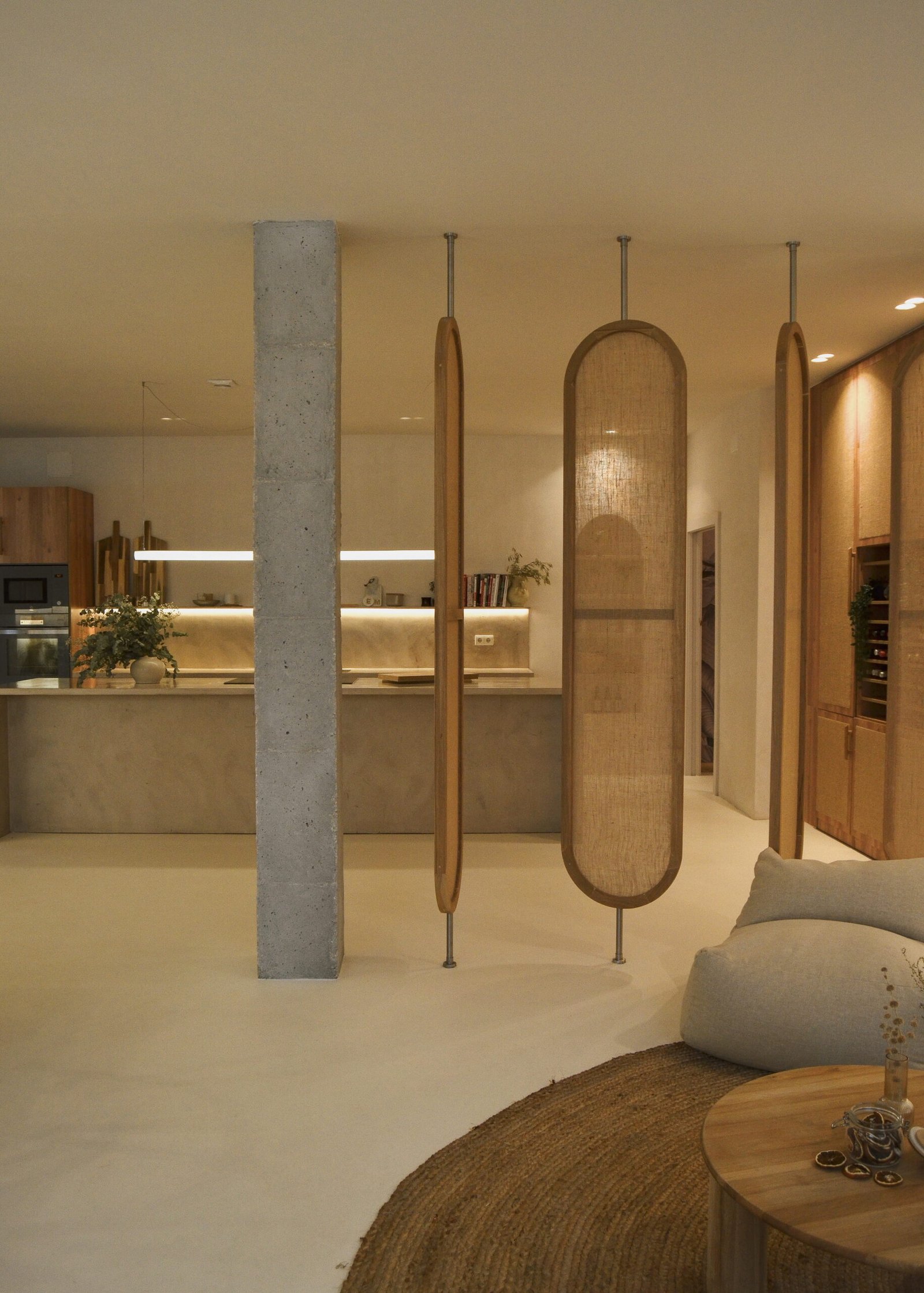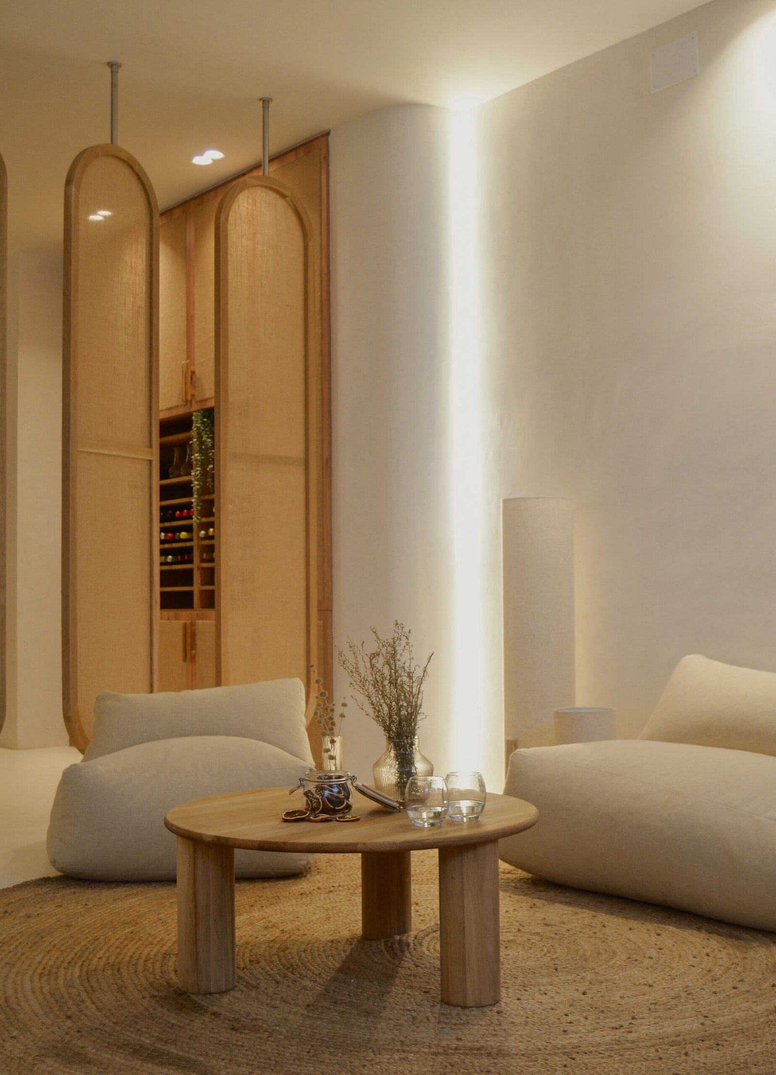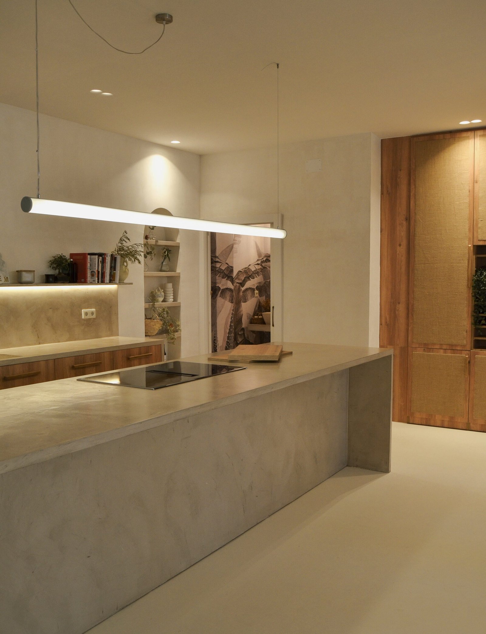 En este proyecto tuvimos la oportunidad de expresar con total libertad nuestras ideas, un lienzo perfecto para disfrutar el arte culinario desde muchos sentidos. Partiendo de la necesidad de un espacio donde poder cocinar para pocas personas y subir contenido culinario a redes sociales, buscamos generar una experiencia en la que el usuario se sienta “como en casa”. El local se divide en varias zonas con diferentes usos: comedor, salón de estar, zona de vinoteca, una jardinera con vegetación y por supuesto una gran cocina central desde la que servir y atender al invitado. Todo ello diseñado con un lenguaje sencillo y neutro donde las formas orgánicas, los materiales naturales como la madera de roble y tejidos en lino, la iluminación planteada para diversas configuraciones y cada detalle, conforman y moldean el espacio.