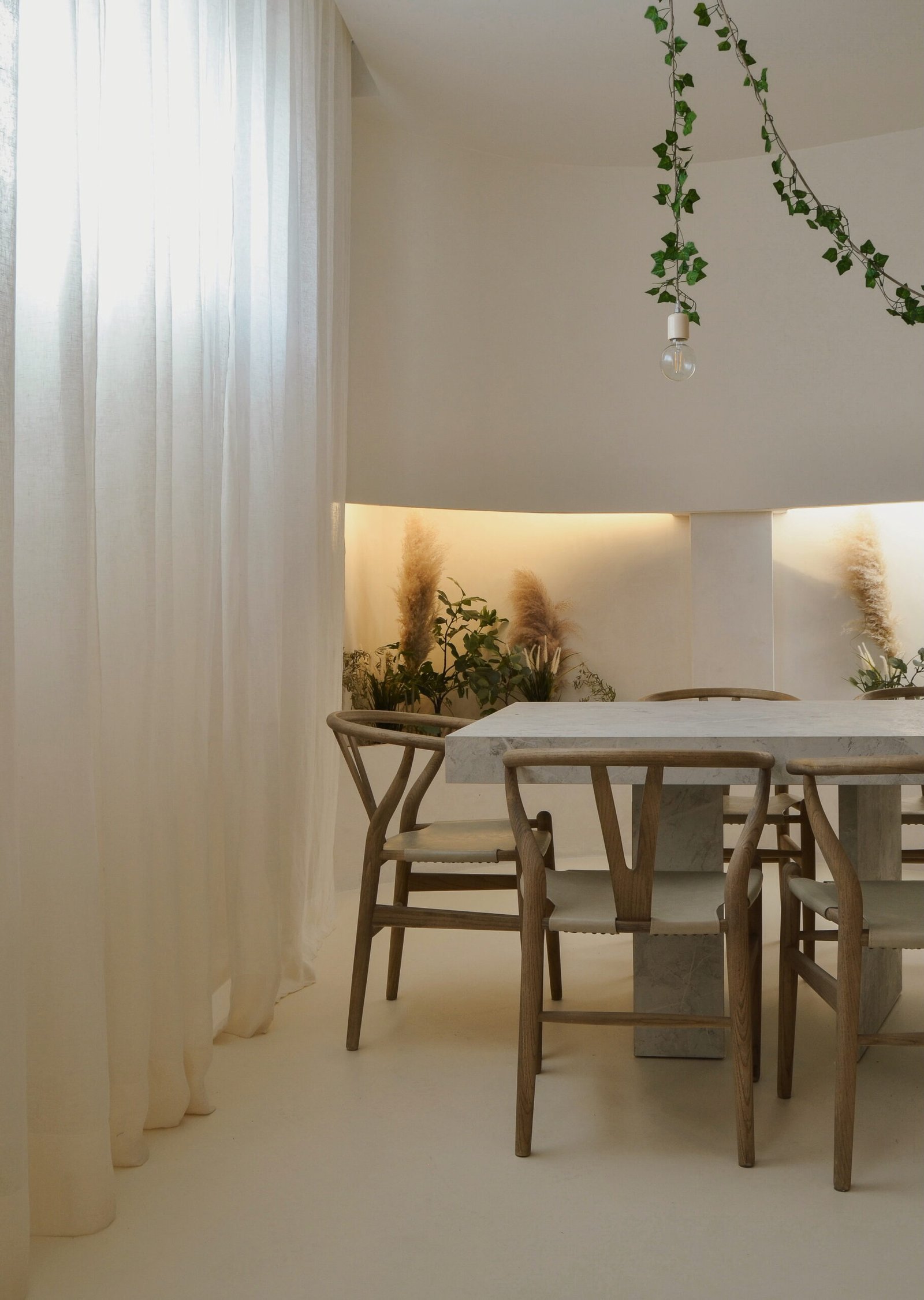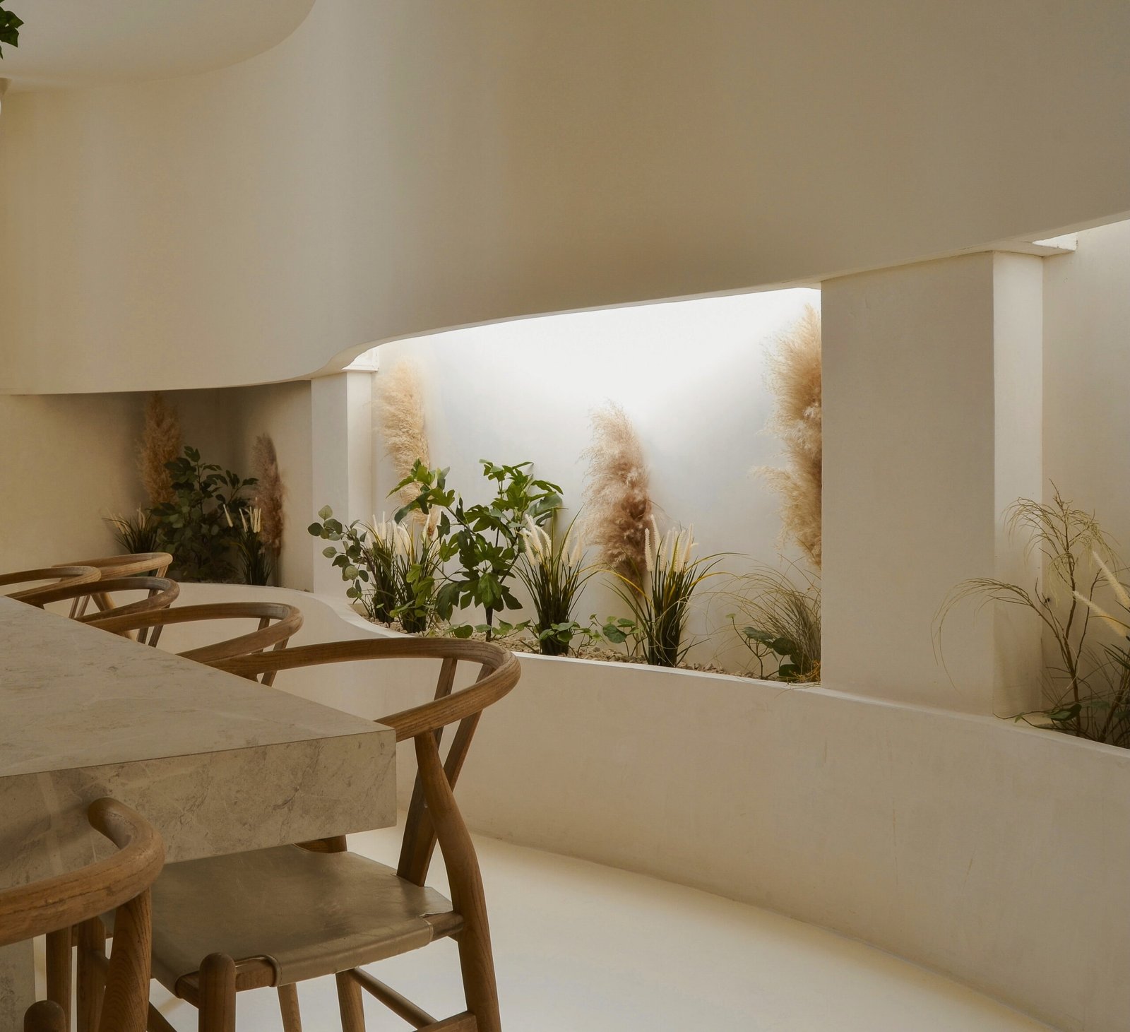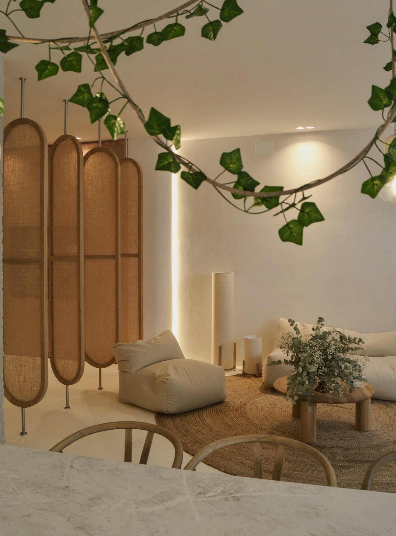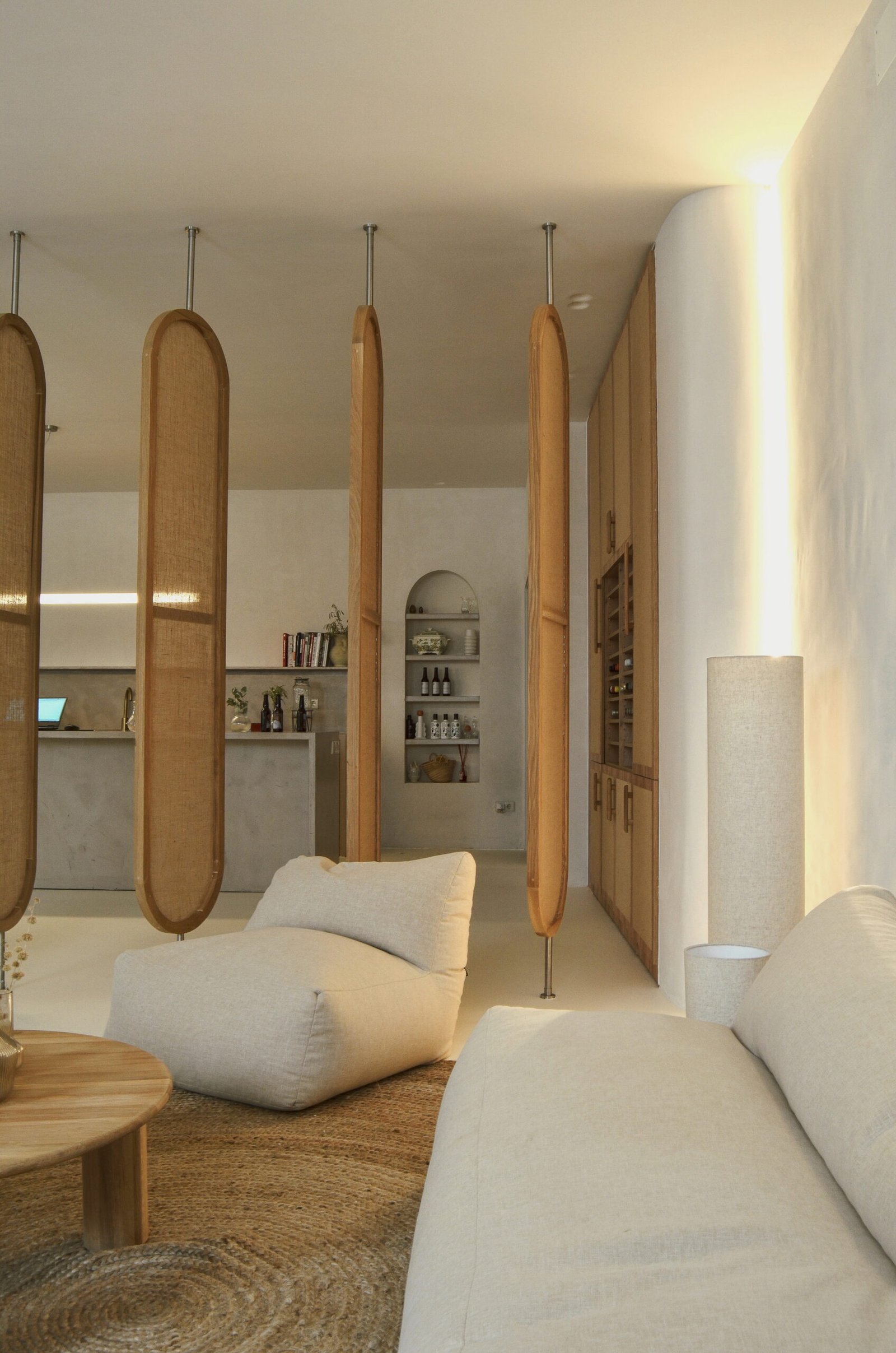 En este proyecto tuvimos la oportunidad de expresar con total libertad nuestras ideas, un lienzo perfecto para disfrutar el arte culinario desde muchos sentidos. Partiendo de la necesidad de un espacio donde poder cocinar para pocas personas y subir contenido culinario a redes sociales, buscamos generar una experiencia en la que el usuario se sienta “como en casa”. El local se divide en varias zonas con diferentes usos: comedor, salón de estar, zona de vinoteca, una jardinera con vegetación y por supuesto una gran cocina central desde la que servir y atender al invitado. Todo ello diseñado con un lenguaje sencillo y neutro donde las formas orgánicas, los materiales naturales como la madera de roble y tejidos en lino, la iluminación planteada para diversas configuraciones y cada detalle, conforman y moldean el espacio.