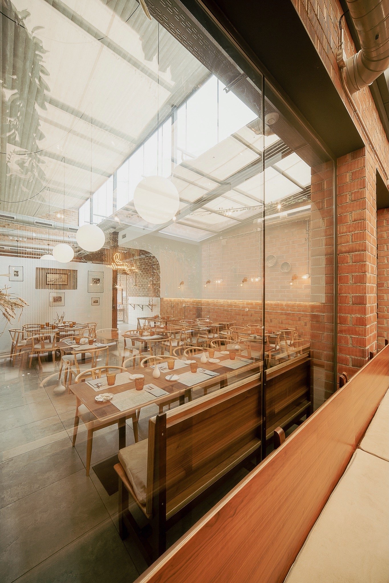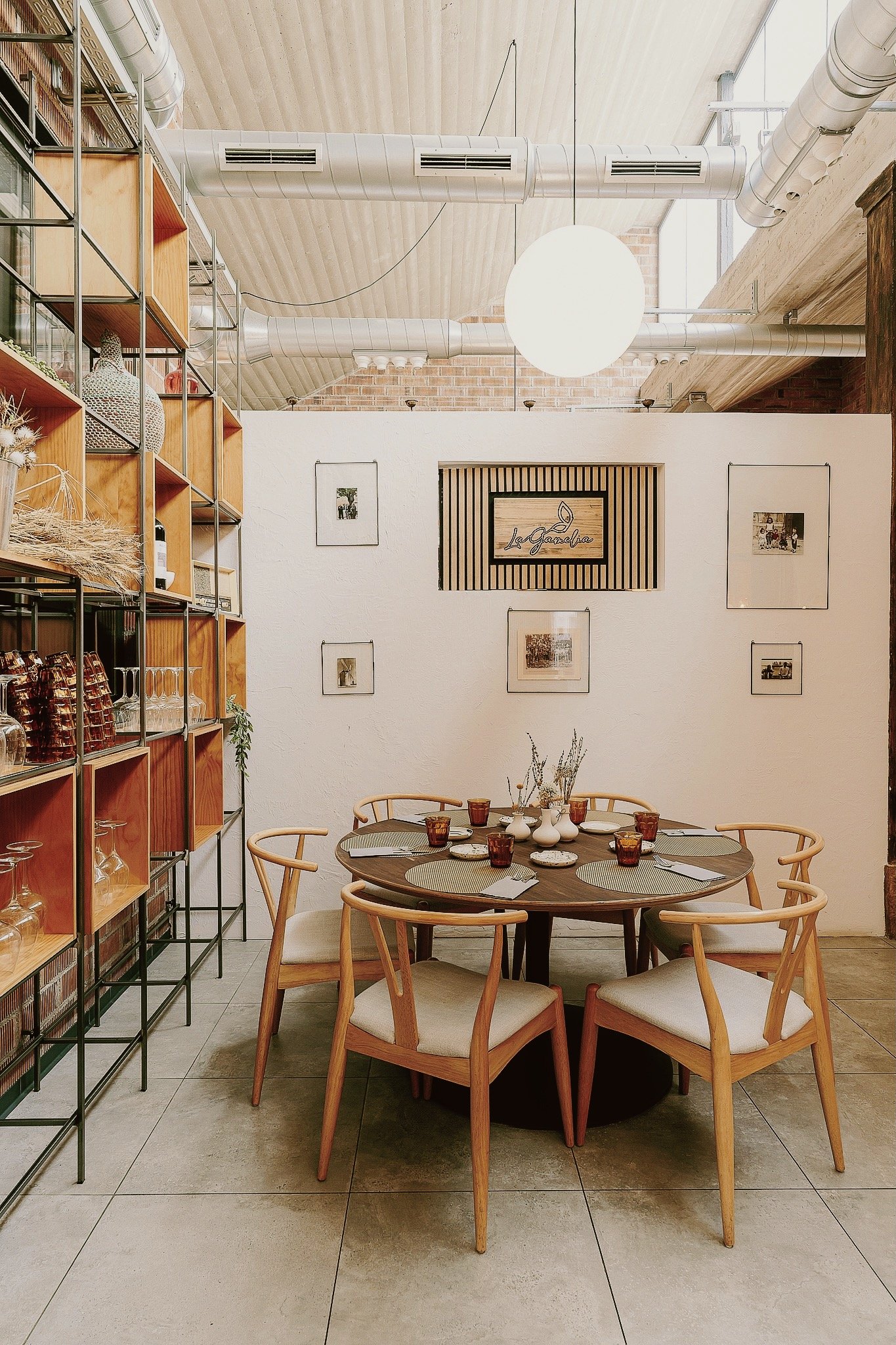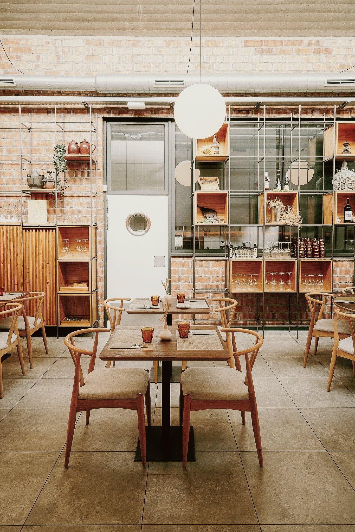 La fusión entre tradición e innovación en un espacio moderno e industrial es un reflejo del tipo de gastronomía ofrecida en este proyecto gastronómico. Buscamos una estética en el interiorismo tradicional manchego respetando el espacio existente al máximo. El interior, ambiente diáfano, combina muros de ladrillo en bruto y hormigón visto en color natural, con instalaciones vistas y mobiliario en madera. La presencia de textiles con colores y estampados tradicionales hace alusión a esa comida típica reinventada en la carta. La parte trasera del restaurante la compone un patio diseñado para dar mayor profundidad al espacio interior y ser utilizada como terraza, donde la presencia de vegetación genera un ambiente acogedor donde poder disfrutar de un espacio de ocio en la parte más privada del restaurante.