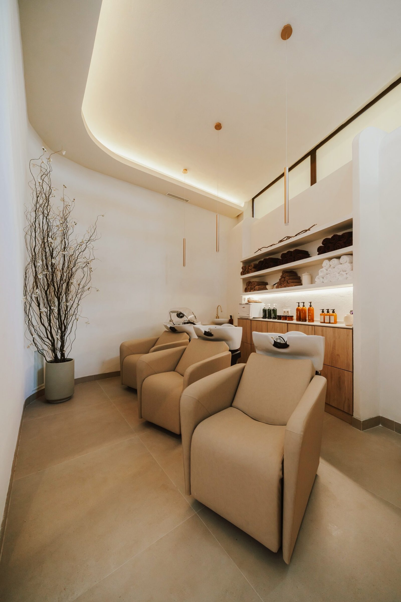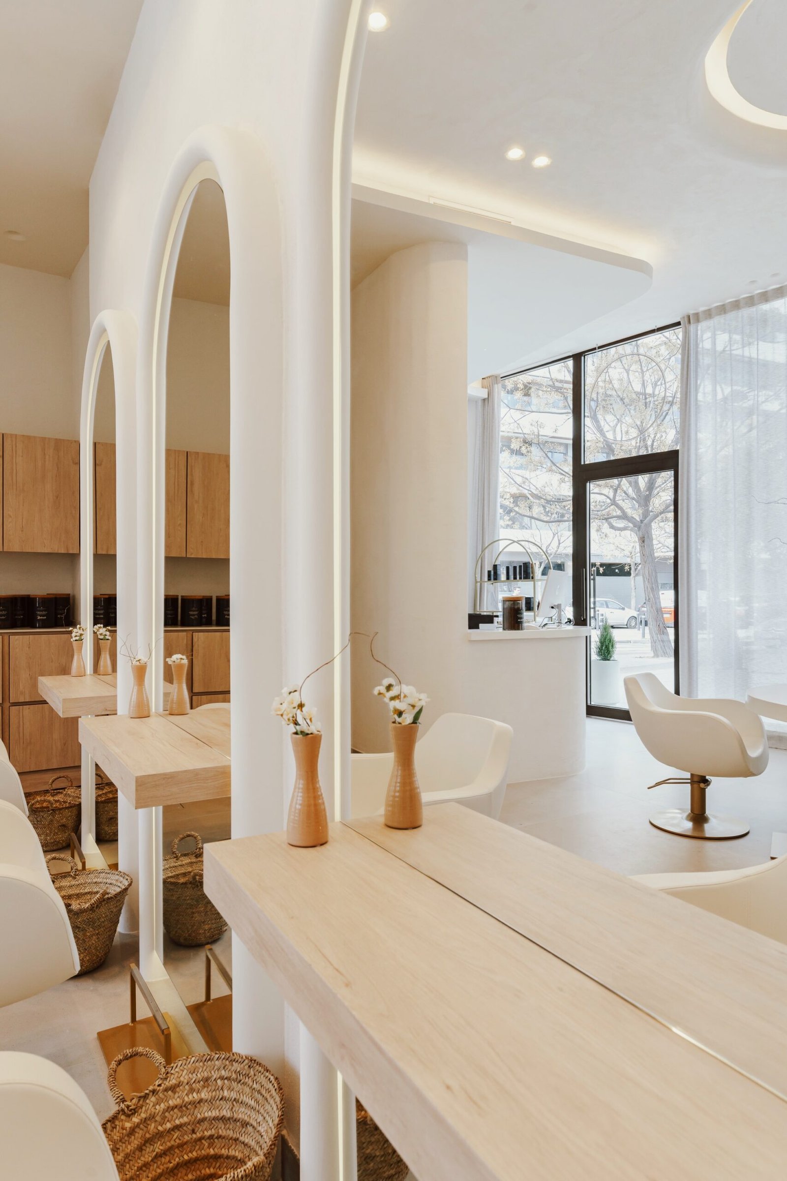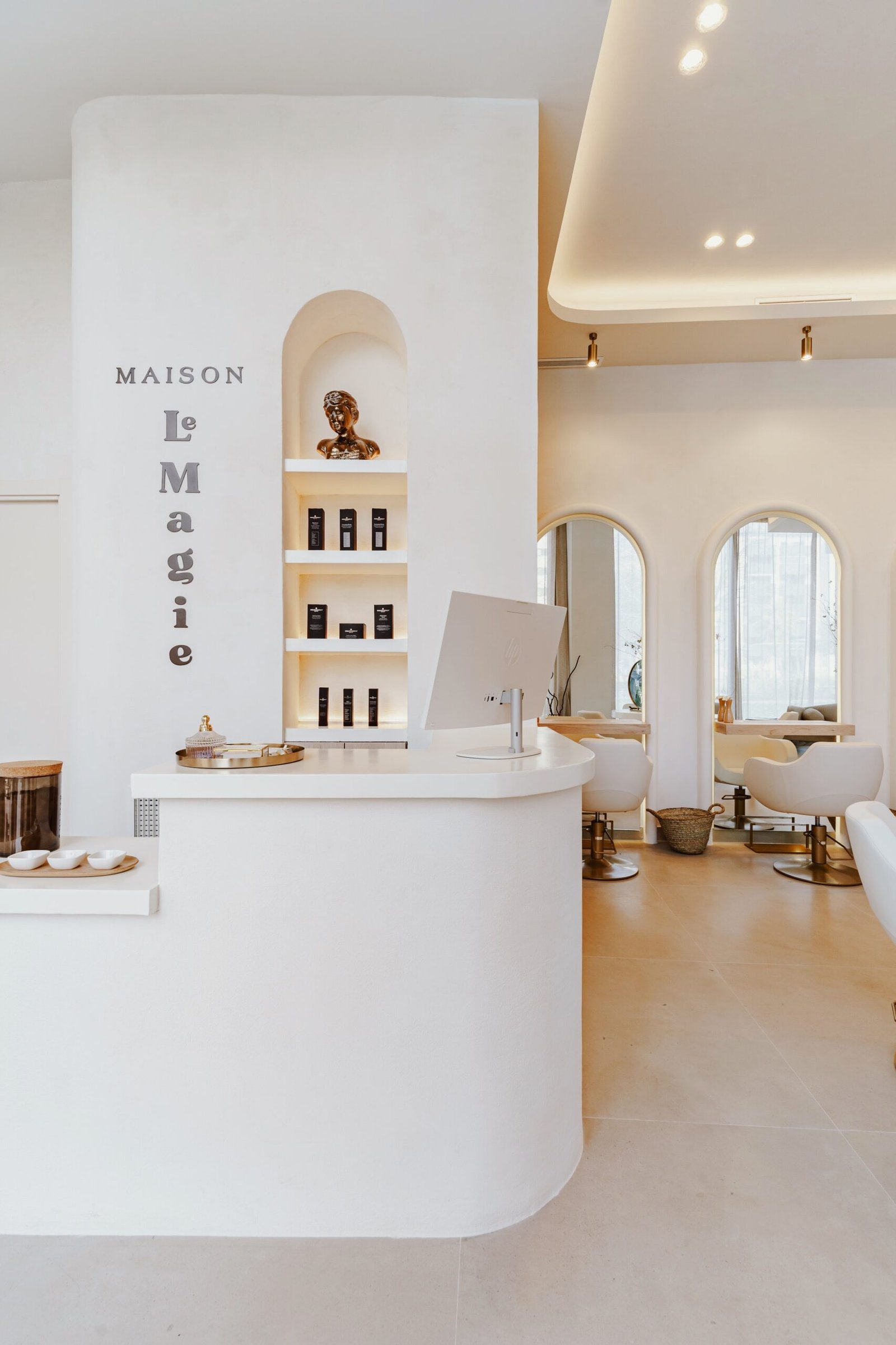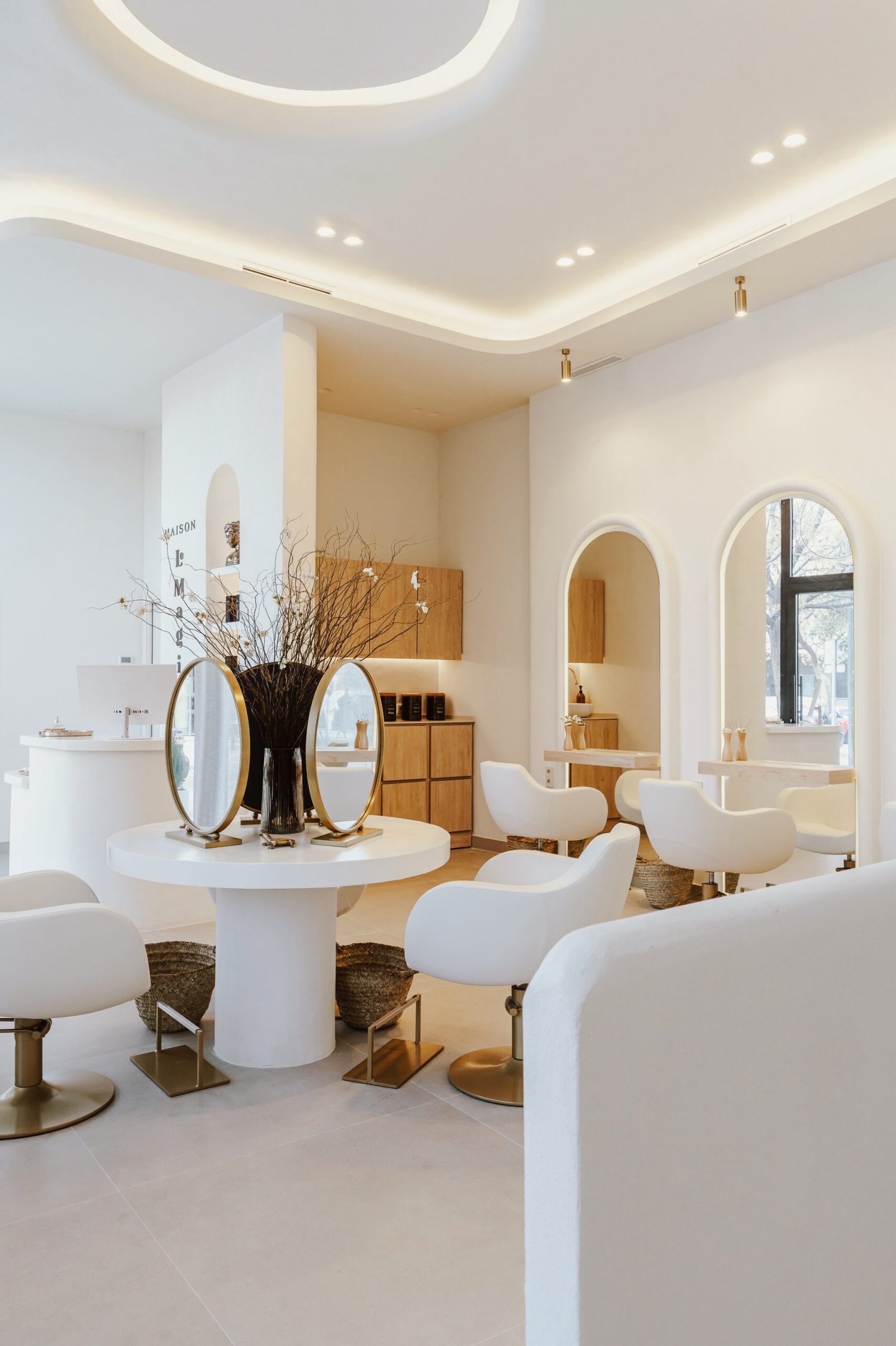 «Le Magie» es un espacio de bienestar y belleza donde el diseño es parte de la experiencia del usuario. Un ambiente neutro con texturas orgánicas que muestra la filosofía de sus tratamientos. En este local buscamos ensalzar los techos de gran altura con la iluminación indirecta y el contraste de texturas. Un óculo central es el protagonista que enmarca la zona central de tocadores. Los demás puestos de trabajo se encuentran enmarcados con unos arcos que aportan detalle al momento del peinado. El almacenaje oculto aporta limpieza visual, tanto en cabinas como en los espacios abiertos.